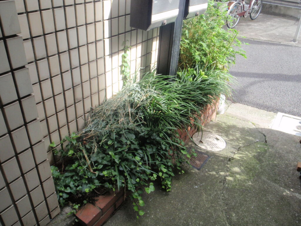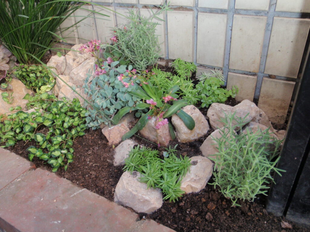 花壇の雑草が伸び放題で困っているとの相談を受けましたので、玄関脇の花壇を、ロックガーデン風に改修しました。イエロー系の景石と砂利を使い、明るい雰囲気にしました。植物は既存の植物を生かしながら、新たにセダムなどの乾燥に強い植物を中心にワイルド感のあるローズマリーなどを植栽しました。